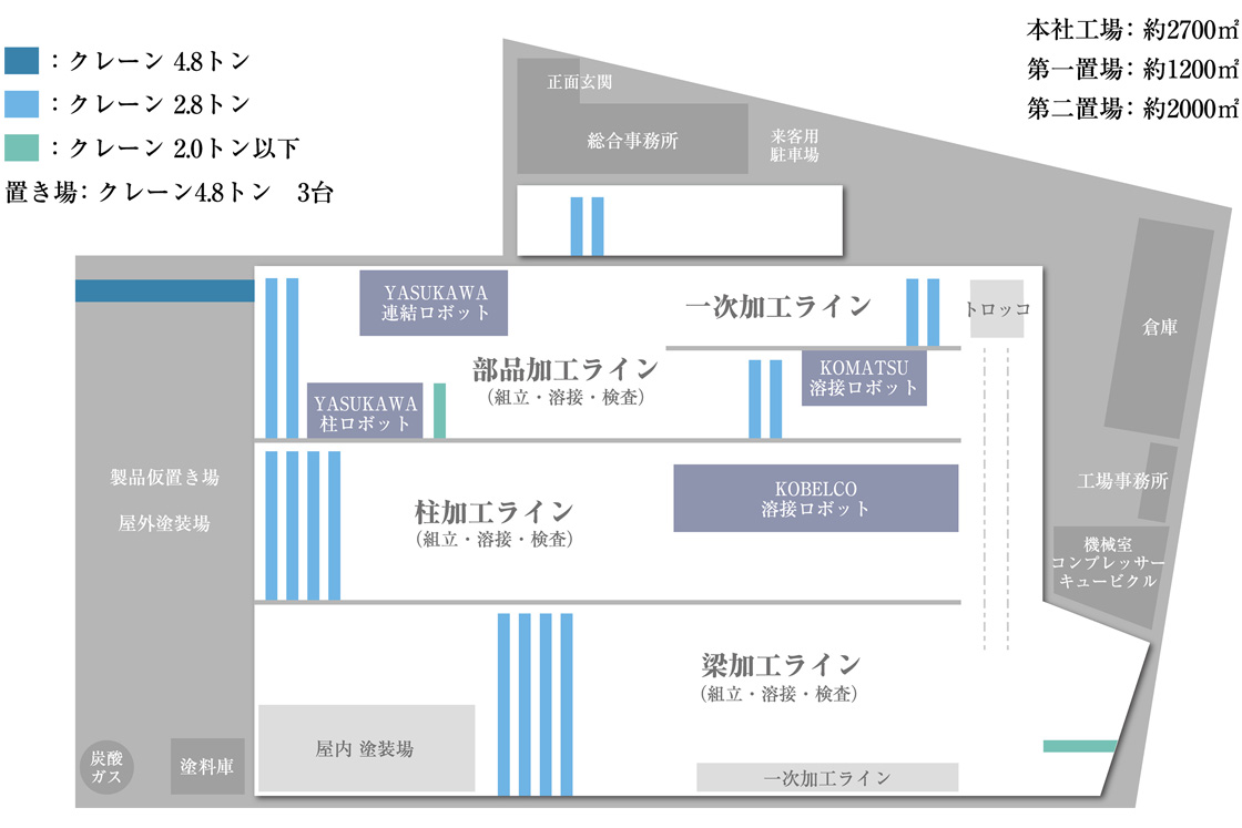 | クレーン設備 | 門型クレーン 4.8t | 4台 | 天井クレーン 2.8t | 16台 |